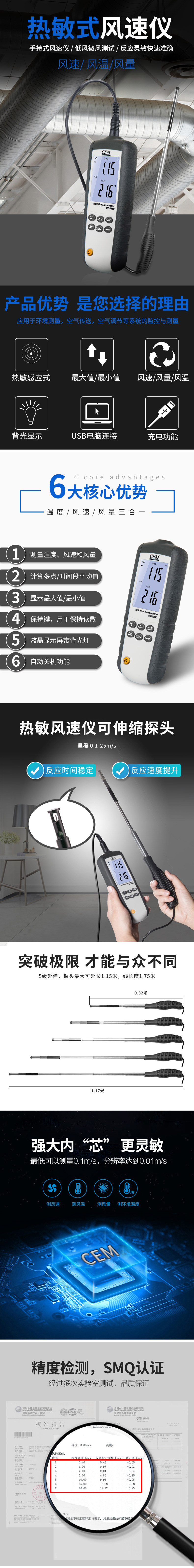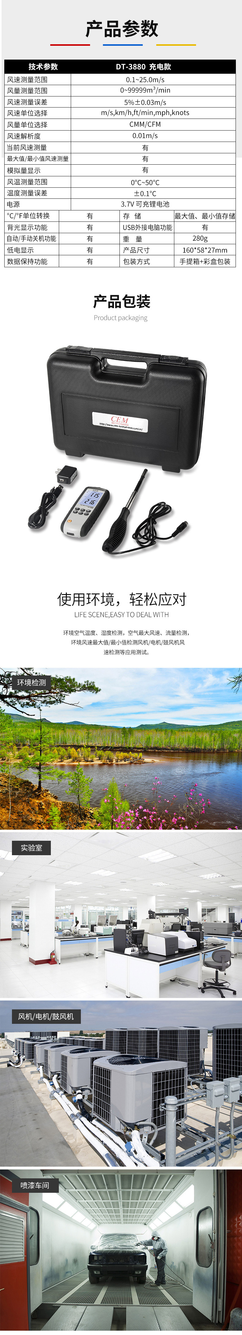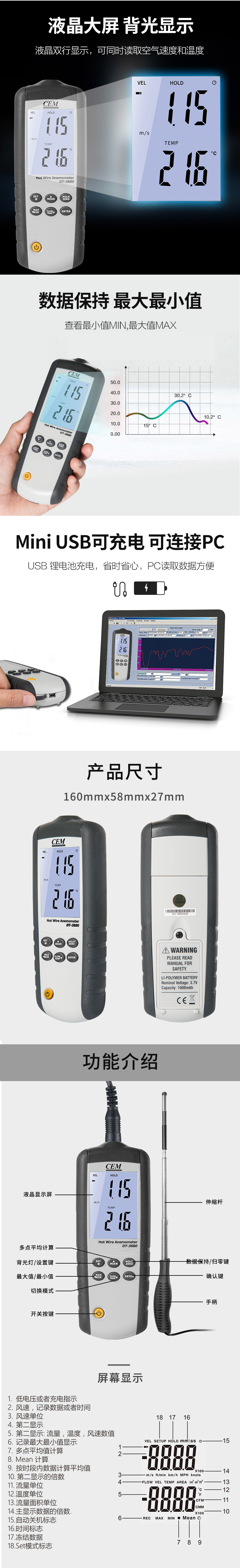 DT-3880熱敏式風(fēng)速儀是CEM新推出的一款性能穩(wěn)定、高精度、帶可充電鋰電池的熱敏式風(fēng)速儀,1.5M的熱敏式探頭,可測量風(fēng)速,風(fēng)溫,風(fēng)量以及環(huán)境溫度。在室內(nèi)空氣、工業(yè)健康環(huán)境、管道、暖通空調(diào)等領(lǐng)域都能發(fā)揮準(zhǔn)確測量的檢測功能。