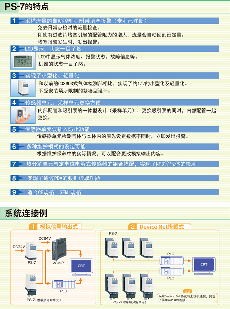 PS-7是一款通過(guò)更換傳感器單元可以檢測(cè)多種氣體,可通過(guò)PDA讀取數(shù)據(jù)。通過(guò)更換傳感器就可以檢測(cè)多種氣體的半導(dǎo)體材料氣體檢測(cè)器;傳感器經(jīng)過(guò)校準(zhǔn)和交付,無(wú)需現(xiàn)場(chǎng)氣體校準(zhǔn)。此外,無(wú)需工具即可輕松更換傳感器;小巧輕便的設(shè)計(jì);通過(guò)LCD顯示屏輕松了解氣體濃度,報(bào)警狀態(tài)和錯(cuò)誤信息;采樣流量的自動(dòng)控制功能;當(dāng)插入與設(shè)置不同的傳感器時(shí),傳感器具有防止錯(cuò)誤插入的功能;通過(guò)連接PDA,可以獲取存儲(chǔ)在檢測(cè)單元中的數(shù)據(jù);轉(zhuǎn)換器單元(選件)可用于檢測(cè)NF3和CCl2;符合CE標(biāo)準(zhǔn);符合SEMI標(biāo)準(zhǔn)。產(chǎn)品用于石油化工、半導(dǎo)體制造等。