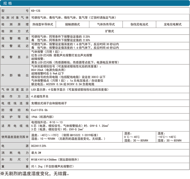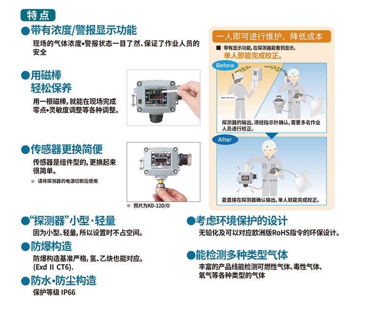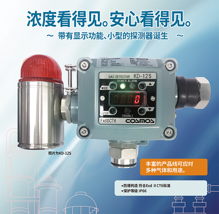 KD-12系列是一款數(shù)值顯示、聲光報(bào)警多種氣體檢測(cè)儀。殼體可搭載隔爆式聲光報(bào)警燈;帶濃度顯示功能,在現(xiàn)場(chǎng)可讀取濃度;使用磁棒操作,維護(hù)簡(jiǎn)單;單元式傳感器,方便替換;隔爆型外殼設(shè)計(jì) ExdII CT6;防水防塵構(gòu)造 保護(hù)等級(jí)IP66;輕量化設(shè)計(jì)采用免螺絲式端子臺(tái),接線簡(jiǎn)單基板電子部件和焊接實(shí)現(xiàn)無(wú)鉛化。用于燃?xì)狻⑹突ぁ⑵?chē)、船舶等行業(yè)。