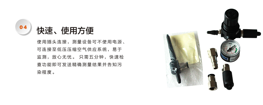 使用插頭連接,測(cè)量設(shè)備可不使用電源、可連接至低壓壓縮空氣供應(yīng)系統(tǒng),易于監(jiān)測(cè),放心無(wú)憂。 只需五分鐘,快速檢查功能即可發(fā)送精確測(cè)量結(jié)果并告知污染程度。