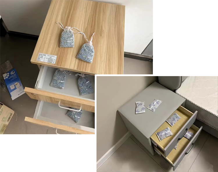 像柜子、抽屜這樣的密閉空間或者通風(fēng)不好的角落,可以放一些活性炭(注意要定期更換、暴曬)或者容森巖(這個(gè)材料不飽和,不用定期更換)吸附。