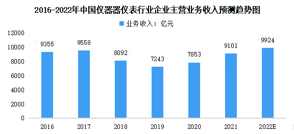 目前,我國(guó)儀器儀表行業(yè)的產(chǎn)品門(mén)類(lèi)、品種比較齊全,布局較為合理,且已具備可觀的技術(shù)基礎(chǔ)和生產(chǎn)規(guī)模。數(shù)據(jù)顯示,我國(guó)儀器儀表行業(yè)企業(yè)主營(yíng)業(yè)務(wù)收入在2016年-2017年小幅增長(zhǎng)后下降至2019年的7243億元,在2019-2021年呈增長(zhǎng)趨勢(shì)。隨著節(jié)能降耗、民生產(chǎn)業(yè)、戰(zhàn)略性新興產(chǎn)業(yè)的持續(xù)發(fā)展以及國(guó)家對(duì)食品安全和環(huán)境保護(hù)的重視程度加大,為我國(guó)儀器儀表行業(yè)帶來(lái)了新的機(jī)遇。中商產(chǎn)業(yè)研究院預(yù)測(cè),2022年我國(guó)儀器儀表行業(yè)企業(yè)主營(yíng)業(yè)務(wù)收入將達(dá)9924億元。