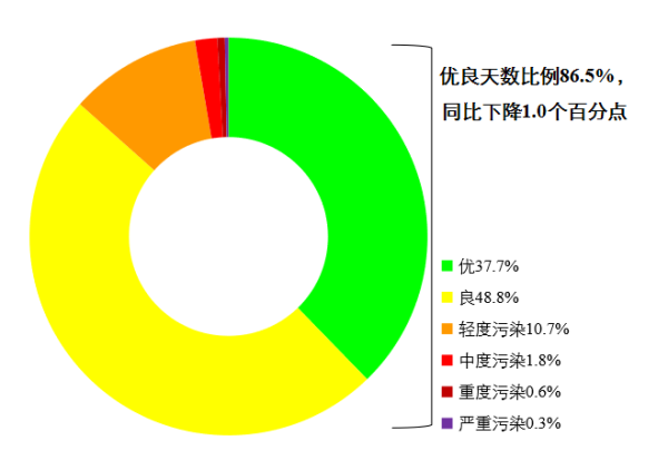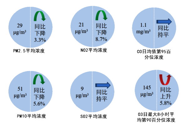 1—12月,全國339個(gè)地級(jí)及以上城市平均空氣質(zhì)量優(yōu)良天數(shù)比例為86.5%,同比下降1.0個(gè)百分點(diǎn);PM2.5平均濃度為29微克/立方米,同比下降3.3%;PM10平均濃度為51微克/立方米,同比下降5.6%;O3平均濃度為145微克/立方米,同比上升5.8%;SO2平均濃度為9微克/立方米,同比持平;NO2平均濃度為21微克/立方米,同比下降8.7%;CO平均濃度為1.1毫克/立方米,同比持平。