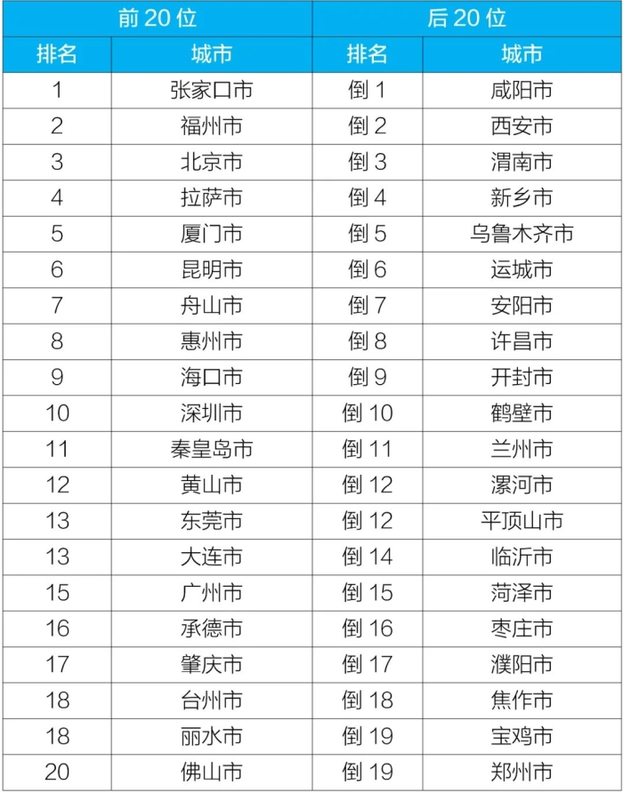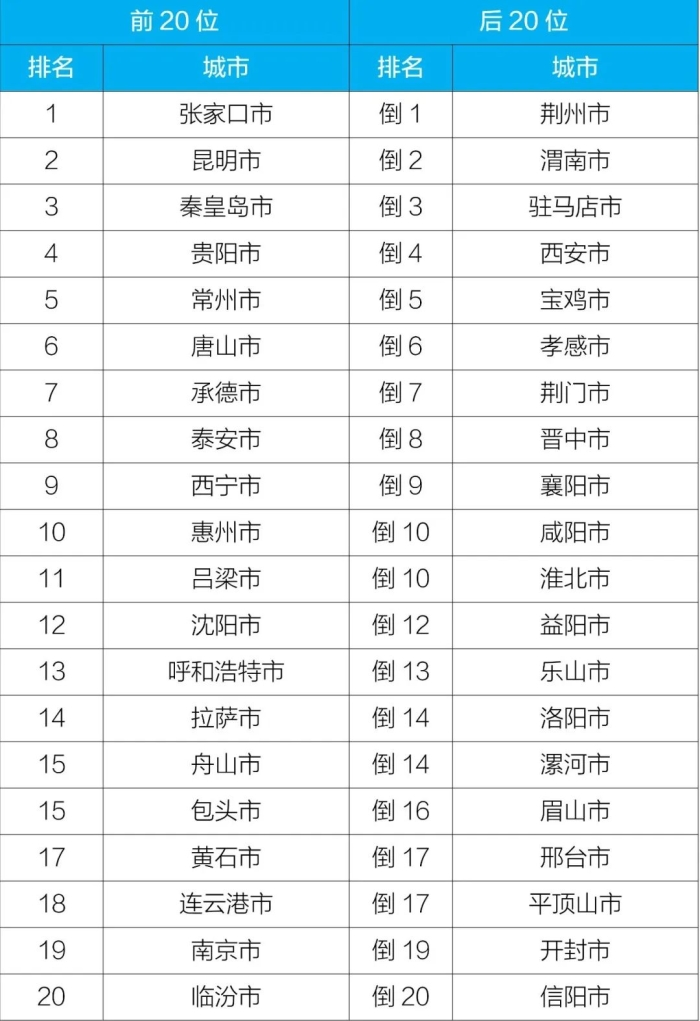 12月,168個(gè)重點(diǎn)城市中,張家口、福州和北京市等城市空氣質(zhì)量相對(duì)較好(從第1名至第20名);咸陽、西安和渭南市等城市空氣質(zhì)量相對(duì)較差(從倒數(shù)第1名至并列倒數(shù)第19名),見附表1。