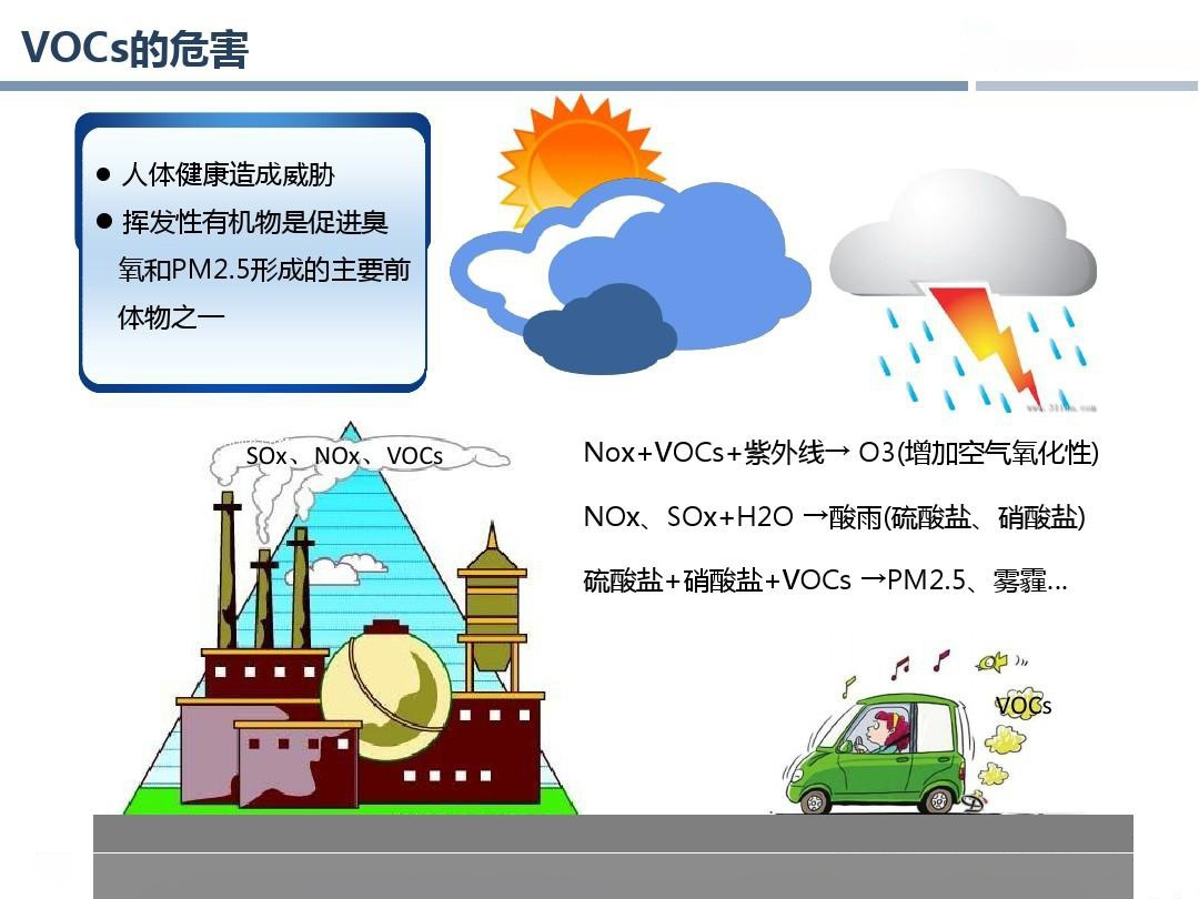 VOC室外主要來自燃料燃燒和交通運輸;室內(nèi)主要來自燃煤和天然氣等燃燒產(chǎn)物、吸煙、采暖和烹調(diào)等得煙霧,建筑和裝飾材料、家具、家用電器、清潔劑和人體本身的排放等。