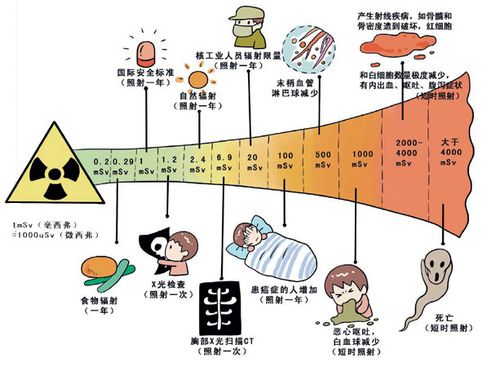健康受損程度取決于暴露在輻射中的時(shí)間以及放射性物質(zhì)的衰變中產(chǎn)生電離輻射。它能破壞人體組織里分子和原子之間的化學(xué)鍵,可能對人體重要的生化結(jié)構(gòu)與功能產(chǎn)生嚴(yán)重影響。