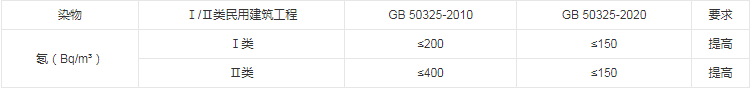 《民用建筑工程室內(nèi)環(huán)境污染控制標準》GB50325-2020新標準于2020年8月1日開始正式實施,與GB50325-2001舊版規(guī)定I.類民用建筑和Ⅱ.類民用建筑氡濃度對比如下: