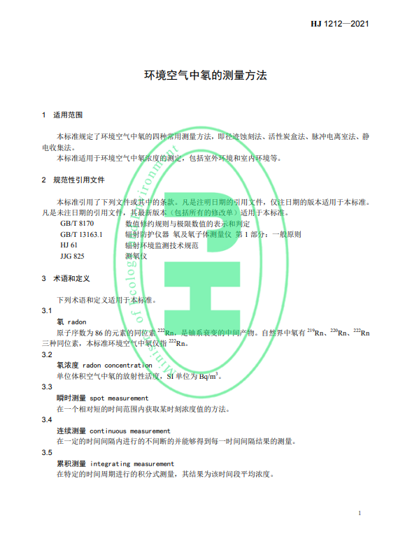 室內(nèi)氡濃度控制標準:從1995年到2004年,中國先后頒布了《住房內(nèi)氡濃度控制標準》GB/T16146-1995、《民有建筑工程內(nèi)部環(huán)境污染控制規(guī)范》GB50325-2001、《地下建筑氡及其子體控制標準》GB16356-1996、《人防工程平時使用環(huán)境衛(wèi)生標準》GB/T17216-1998和《室內(nèi)空氣質(zhì)量標準》GB/T18883-2002,均明確了各類建筑物的室內(nèi)氡濃度控制標準。2004年國家住宅與居住環(huán)境工程中心制訂的《健康住宅建設(shè)技術(shù)要點(2004版)》中也將氡濃度控制標準列入了人居健康工程的室內(nèi)空氣質(zhì)量標準的要素之中。其中,《地下建筑氡及其子體控制標準》GB16356-1996規(guī)定:(1)已建的地下建筑的行動平衡當量濃度為400。(2)待建的地下建筑的行動平衡當量濃度為200。這是基于中國地下建筑使用情況,即通常不作為永久性住宅的考慮。若實際情況并非如此,則應(yīng)采用相應(yīng)標準規(guī)定的控制水平。《民用建筑工程內(nèi)部環(huán)境污染控制規(guī)范》GB50325-2001規(guī)定:I.類民用建筑(住宅、醫(yī)院、老年建筑、幼兒園、學校教室等)氡濃度限量≤200;Ⅱ.類民用建筑(辦公樓、商店、旅館、圖書館、展覽館、體育館、公共交通等候車室、餐廳、理發(fā)店等)氡濃度限量≤400。并規(guī)定“民用建筑工程及室內(nèi)裝修工程的室內(nèi)環(huán)境質(zhì)量驗收,應(yīng)在工程完工至少7天以后、工程交付使用前進行。”“室內(nèi)環(huán)境質(zhì)量驗收不合格的民用建筑工程,嚴禁投入使用。”