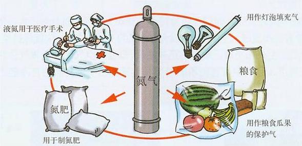 4、氮氣可用于合成一氧化氮或二氧化氮,以此來制造硝酸,這種制造方法純度高且價格較為低廉。此外氮氣還可用于合成氨及金屬氮化物等