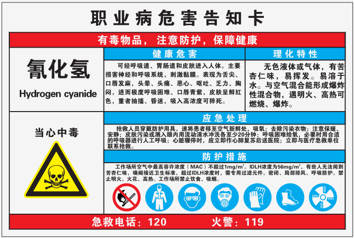 氰化氫標準狀態(tài)下為液體。氰化氫易在空氣中均勻彌散,在空氣中可燃燒。氰化氫在空氣中的含量達到5.6%~12.8%時,具有爆炸性。氫氰酸屬于劇毒類。急性氰化氫中毒的臨床表現(xiàn)為患者呼出氣中有明顯的苦杏仁味,輕度中毒主要表現(xiàn)為胸悶、心悸、心率加快、頭痛、惡心、嘔吐、視物模糊。重度中毒主要表現(xiàn)呈深昏迷狀態(tài),呼吸淺快,陣發(fā)性抽搐,甚至強直性痙攣。二次世界大戰(zhàn)中納粹德國常把氰化氫作為毒氣室的殺人毒氣使用。