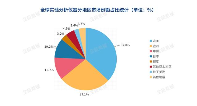 實(shí)驗(yàn)分析儀器行業(yè)是典型的高附加值、技術(shù)密集型產(chǎn)業(yè),其下游市場(chǎng)覆蓋了工業(yè)、農(nóng)業(yè)、食品、醫(yī)藥衛(wèi)生、科研、環(huán)保、航空航天等多方面。從區(qū)域分布來(lái)看,北美、歐洲、中國(guó)和日本是主要市場(chǎng)。北美市場(chǎng)份額排名全球第一,占比37%;其次為歐洲,占比27.1%;中國(guó)市場(chǎng)容量排在全球第三,占比11.7%;日本排在全球第四,占比10.2%。