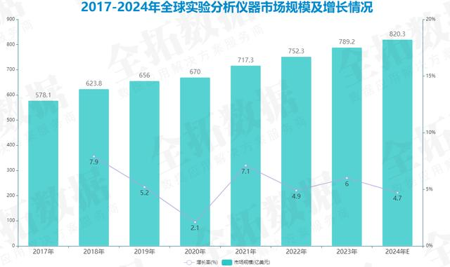 全拓?cái)?shù)據(jù)顯示,全球?qū)嶒?yàn)分析儀器市場(chǎng)規(guī)模由2017年的578.1億美元增至2023年的789.2億美元,年均復(fù)合增長(zhǎng)率為5.9%。預(yù)測(cè)2024年全球?qū)嶒?yàn)分析儀器市場(chǎng)規(guī)模可達(dá)820.3億美元。