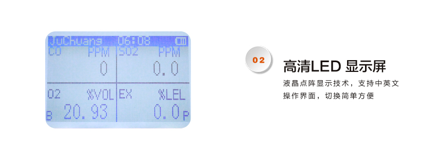 ●屏幕可顯示氣體分子式、含量、顯示單位、時間等